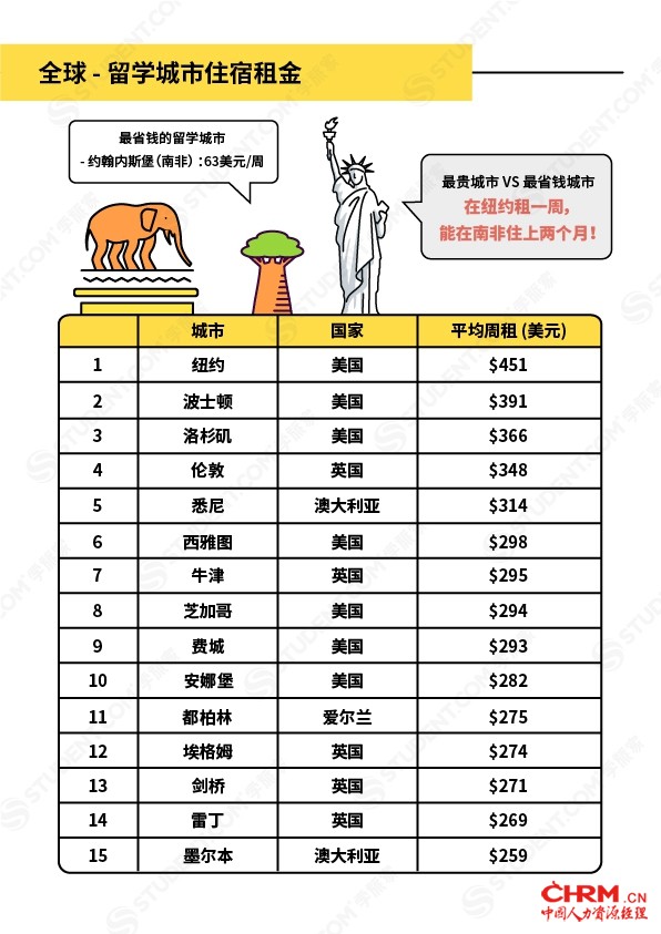 2、英美澳留学生租房支出最多的城市分别为:伦敦(268英镑/周)、纽约(451美元/周)、悉尼(432澳元/周);而南非约翰内斯堡的留学生支出的房租最少,仅为 63美元/周。