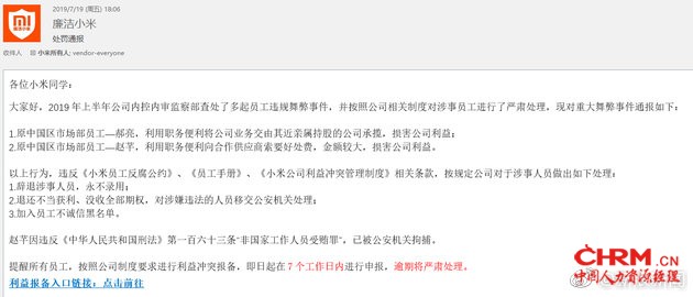 据报道,还有原小米中国区市场部员工郝亮,利用职务便利将公司业务交由其近亲属持股的公司承揽,也被小米公司通报。