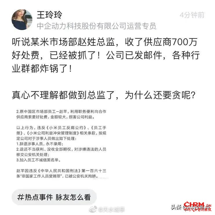 小米公司美女总监赵芊,贪污700万巨款,锒铛入狱! 近日,小米在内部通报称,两位中国区市场部员工违规舞弊,已被辞退并移送公安机关。其中一人因涉嫌非国家人员受贿罪,被公安机关拘捕。