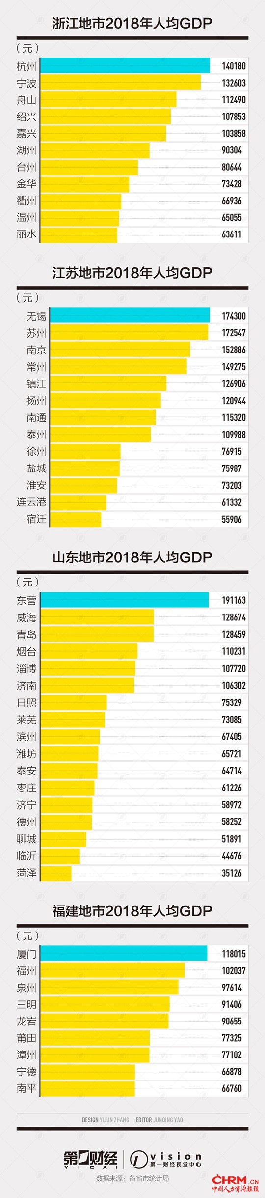 第一财经记者统计发现,在广东21个地市中,2018年仅有7个地市人均GDP高于全国平均水平64644元,剩余2/3的地市人均GDP低于全国平均水平,其中,有11个地市人均GDP低于5万元。而闽浙苏没有一个地市人均GDP低于5万元,山东也仅有2个地市低于这一标准。