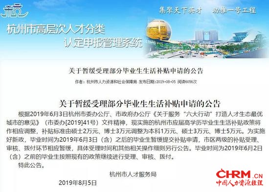 8月5日,杭州市人才服务局发布《关于暂缓受理部分毕业生生活补贴申请的公告》。