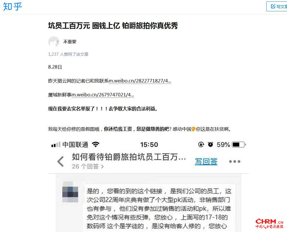 值得一提的是,在网友发布该维权贴后,多位声称是铂爵旅拍的员工在知乎、微博平台留言表示遇到了同样的遭遇。而还有网友上传视频显示为“铂爵旅拍要求员工拉亲友刷业绩”。