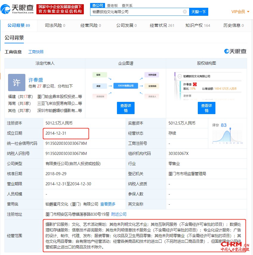 天眼查数据显示,铂爵旅拍的运营主体为铂爵旅拍文化有限公司,成立于2014年12月31日,创始人、法定代表人、最终受益人为许春盛,经营范围包括摄影扩印服务、文化、艺术活动策划、专业化设计服务等,共拥有22家企业的实际控制权。