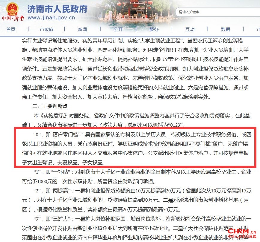 8月5日,济南市人民政府网站挂出《济南市人民政府关于进一步做好促进就业创业工作的实施意见》政策解读,其中提到“落户零门槛”:具有国家承认的专科及以上学历人员,或初级以上专业技术职务资格、或四级以上职业资格的人员,凭有效身份证件、学历证明或技术技能资格证明即可“零门槛”落户。