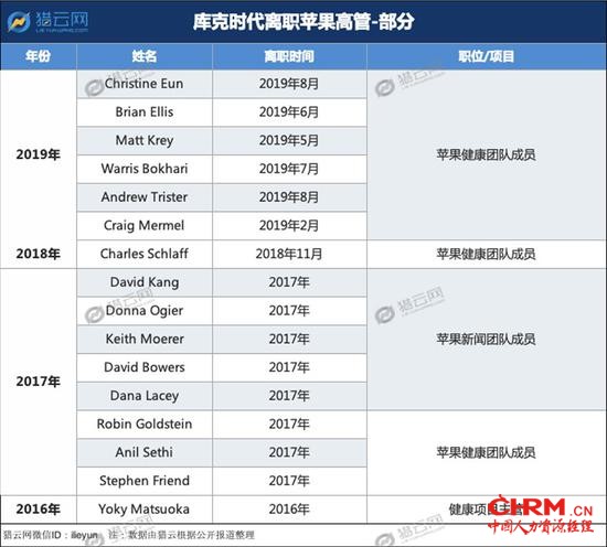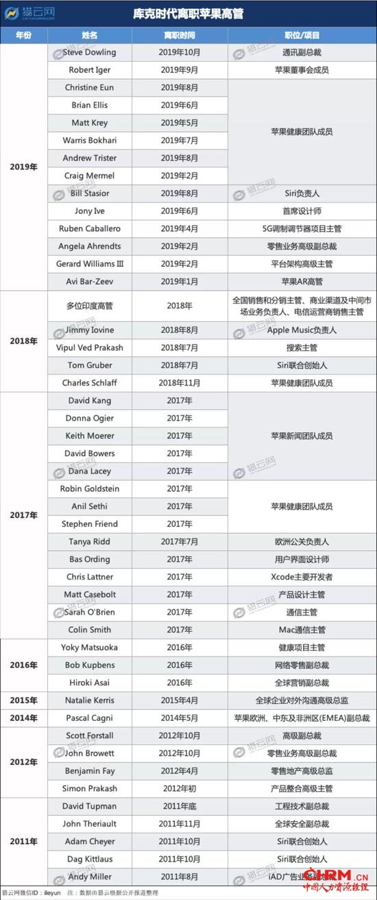 为了更直观地了解苹果近年来的高管离职动向,猎云网收集整合了相关信息,如下图: