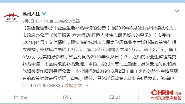 为吸引更多人才留杭就业,杭州将本科毕业生纳入补贴范围。8月6日,杭州人社局官方微博发布《暂缓受理部分毕业生生活补贴申请的公告》,杭州市应届高学历毕业生生活补贴标准由硕士2万元、博士3万元调整为本科1万元、硕士3万元、博士5万元。这份调整公告被认为是杭州抢人大战的再次升级。