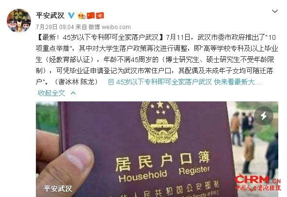 在“抢人”方面成效显著的武汉可谓不遗余力继续对政策加码。7月11日,武汉市委市政府推出了“10项重点举措”,其中对大学生落户政策再次进行调整,即“高等学校专科及以上毕业生(经教育部认证),年龄不满45周岁的(博士研究生、硕士研究生不受年龄限制),可凭毕业证申请登记为武汉市常住户口,其配偶及未成年子女均可随迁落户”。