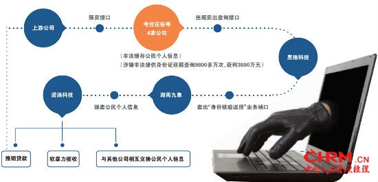 警方调查发现,诺涵科技的公民个人信息主要来自湖南九象信息有限公司(以下简称“湖南九象”),在锁定相关犯罪证据后,淮安警方在长沙、深圳分别将湖南九象法定代表人和技术主管抓获,审讯得知湖南九象黑爬虫网站的“身份核验返照”业务端口来自北京黑格科技有限公司(以下简称“黑格科技”),而黑格科技是从考拉征信等4家公司购买的查询接口。