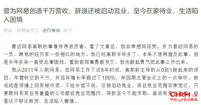 发帖人称,自己2011年入职网易,在网易工作了近8年时间,是一名技术人员,离职前主导的从0到1做起来的项目,年营收达到千万,并且年增长率超过了100%。因跟主管会议上的一次争吵,被说成是顶撞上级而被劝退,不给补偿不说,还被启动竞业,而且竞业范围非常宽泛,只要跟网易有业务重叠的公司都在竞业范围内,导致至今不能求职。虽说有竞业补偿,但是还不够还房贷,生活陷入窘境。