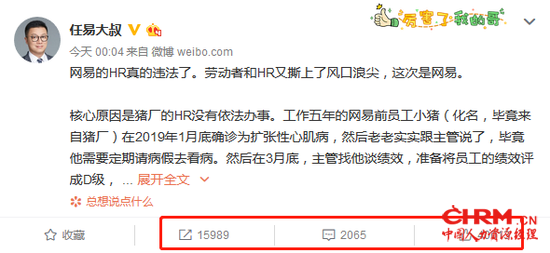微博认证头条文章作者@任易大叔(超15万粉丝):“网易的HR真的违法了。劳动者和HR又撕上了风口浪尖,这次是网易。”