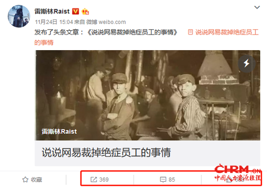 此外,微博认证作家@雷斯林Raist(超63万粉丝)发表《说说网易裁掉绝症员工的事情》:“虽然现在工人受到种种法律的保护,早已不是当年的模样,但也别忘了,底层员工虽然弱势,但手中的武器一直没有消失。”