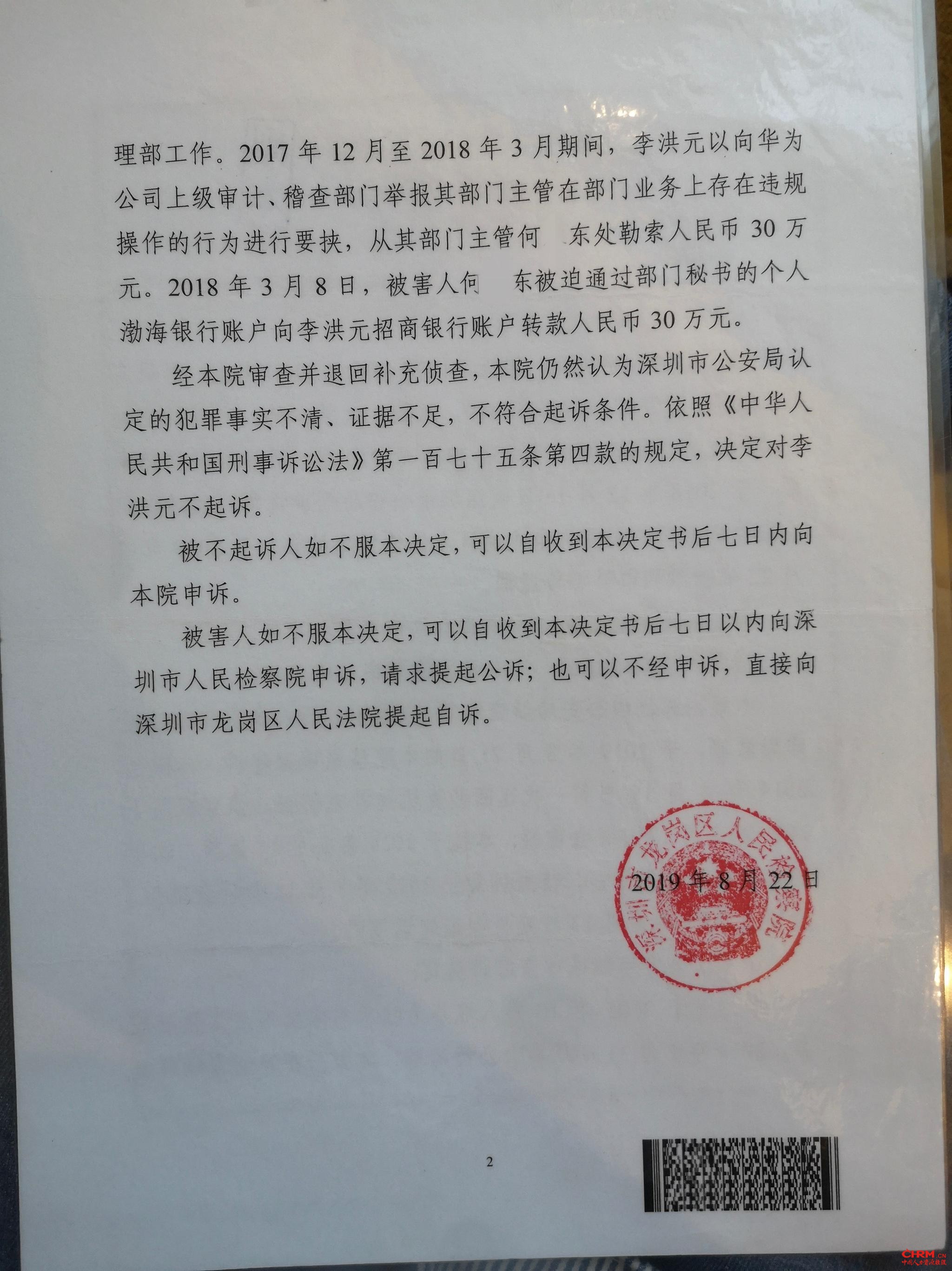 拿到补偿的9个月后,李洪元被深圳市公安机关刑拘、逮捕,最终被深圳市龙岗区检察院决定不起诉。在被羁押的251天里,他先后涉嫌职务侵占、侵犯商业秘密、敲诈勒索三个罪名。从相关法律文书和李洪元辩护律师的调查结果来看,李洪元被抓源于华为的控告。