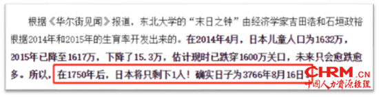 事实上,日本学者和韩国学者都推算过本国人口灭绝时间。比如,根据日本东北大学的研究结论,在公元3766年8月16日这一天,或将会成为日本人灭绝的末日时钟。这个时间是日本东北大学的两位经济学家吉田浩和石垣政裕根据2014年和2015年的生育率研究出来的。2019年12月26日,日本首相安倍就2019年新生儿数首次跌下90万人的这一现状表示,“现在事态十分严峻,说是国难也不为过!”