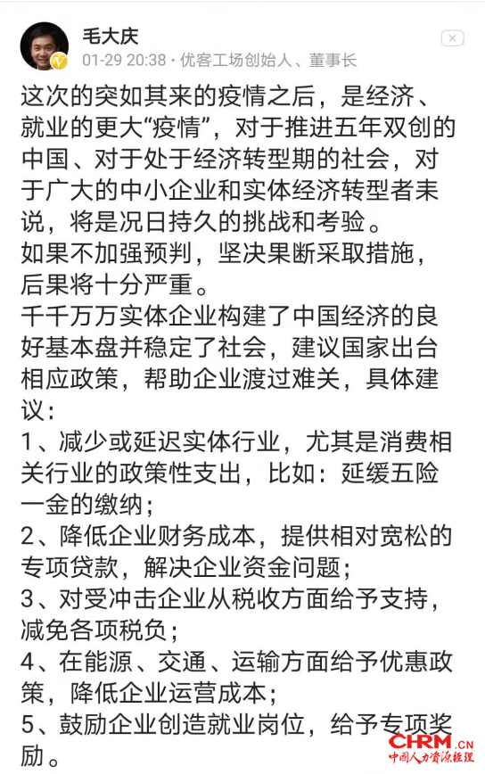 不过,万科前副总裁、优客工厂创始人毛大庆的一项建议则是招骂的,他把“延缓五险一金的缴纳”排在建议的第一位。有网友骂道,这些有钱的老板首先想到的是卡员工脖子,而不是想着去卖掉别墅、高级轿车,或厉行节约不坐头等舱公务舱啊?