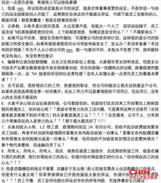 这是一般人的思维,也是现实,君不见这两天疯传的某网络公司要求员工提前上班引发的风波?该网络公司大年初三发通知要求外地员工返京上班,有员工不满,在社交媒体上斥责公司“置员工健康于不顾,想让员工都感染新型肺炎。为了自己的利益,坑员工。老板为了钱,要我们的命”等,没想到硬气的领导不怕事,直接写了8条回应,并建议不想返回加班的员工离开。结果炸开了锅,员工写了千字文,还向有关方面进行了举报。具体内容见图,暂不赘述,公说公有理,婆说婆有理。