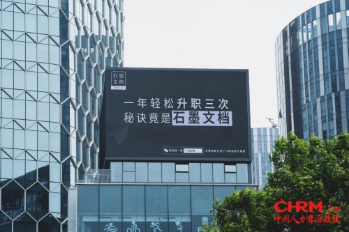近日,一则视频广告出现在三里屯中心地带的广告大屏上。主要内容「一年轻松升职三次,秘诀竟是“石墨文档”」让过往路人不禁注目观看。视频中还提及此产品具有「400+表格函数」,「多人共同编辑文档,团队协作不受时间空间限制」等主要特色。