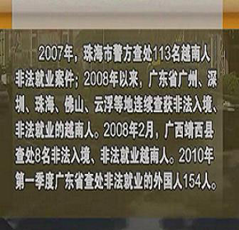 解说:数据显示,1998-2001年间,非法穿越边境到广西的越南人估计在6万人左右。2007年,珠海市警方查处了7宗113名越南人非法就业案件;2008年以来,广东省广州、深圳、珠海、佛山、云浮等地的出入境管理部门均连续查获非法入境、非法就业的越南人。2008年2月28日,广西靖西县查处8名非法入境、非法就业的越南人。2010年第一季度,广东省公安厅不久前公布的数据显示,仅今年广东省查处的非法就业的外国人达154人。近两年来,海南、福建、浙江等地出现了外国人非法就业事件。王大伟教授认为,由于洋黑工的隐蔽性,实际上进入中国打工的洋黑工,数量远远多于官方统计数据。由于来自越南、缅甸的工人薪酬要求较低,在目前很多地方发生用工荒的情况下,很有可能会形成一股潮流。