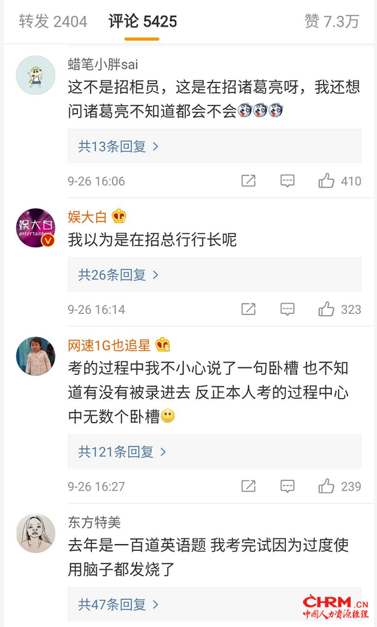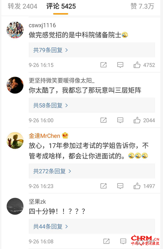 对于该考生的吐槽,有网友在留言区表示,“我以为是在招总行行长呢”,“做完感觉招的是中科院储备院士”,也有网友称,“没给你再整点电竞题就不错了。”
