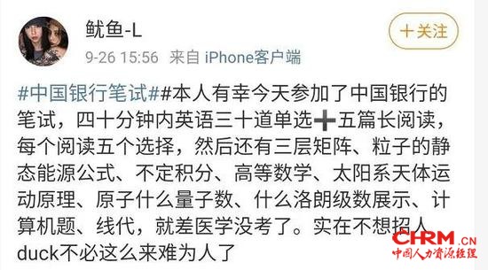 据一位参考考生反映,今天她参加了中国银行的笔试,四十分钟内要完成英语30道单选和5篇长阅读,每个阅读5个选择,“然后还有三层矩阵、粒子的静态能源公式、不定积分、高等数学、太阳系天体运动原理、原子什么量子数、什么洛朗级数展示、计算机题、线代,就差医学没考了。”这位考生甚至表示,“实在不想招人不必这么来难为人了。”