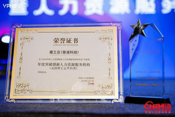 上海2020年12月24日讯-- 12月23日,2020环球人力资源盛典暨人力资源服务商颁奖典礼在上海举行,各项年度大奖正式揭晓,普道科技旗下雁工云被评为“年度突破创新人力资源服务机构”。本次活动由环球人力资源智库(GHR)主办,汇聚了行业内人力资源从业者,各大人力资源服务机构等。