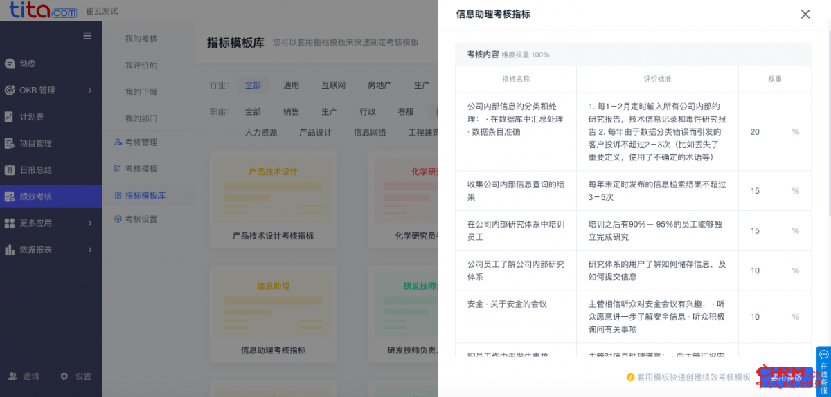 每到年底或年初的时候,各个企业的 HR 又要头痛了,上一年的绩效应该考核,新一年的绩效应该如何制定?如果能看到同行业其他人究竟如何做绩效考核管理的,该多好,至少可以借鉴参与一下啊!在这里,我们为你推荐 Tita绩效宝,它内置上千套各行各业的考核指标,让考核指标的制定不再成为难题!