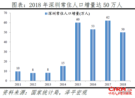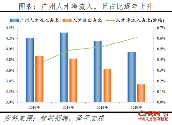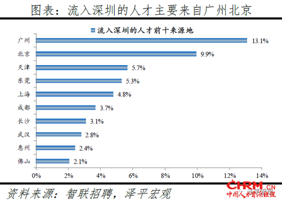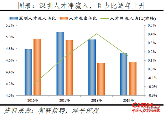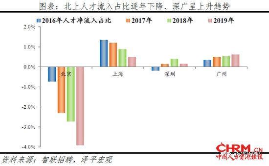3)深圳:2016-2019年人才净流入占比分别为-0.2%、0.1%、0.4%、0.2%,主因深圳经济发展速度较快、人才政策有吸引力;深圳和广州互为人才外流第一目标城市,深圳流向广州和广州流向深圳的人才流出在全国流动人才总量中占比分别为0.7%、0.6%,规模基本平衡。2015年深圳常住人口增量从2014年的15万大幅上升至60万,2015-2018年平均增量为56万。2016-2019年深圳人才流入占比基本稳定在4.9%左右,分别为4.8%、5.1%、5.0%、4.7%,但人才流出占比呈下降趋势,分别为5.0%、4.9%、4.6%、4.6%。从来源看,人才向深圳流入的前十大城市分别为广州、北京、天津、东莞、上海、成都、长沙、武汉、惠州、佛山,合计占比达52.8%,高于2018年前十来源地的50.4%,深圳的人才来源集中度有所提高。其中,珠三角城市有4个,占比22.9%;流入深圳的人才中13.1%来自广州,流入广州的人才中17.4%来自深圳,深圳和广州互为人才来源城市的第1位。人才流入深圳主要因为经济发展速度相对较快和人才政策有吸引力。2019年深圳GDP增速6.7%,高于全国平均的6.1%,也高于北京和上海的6.1%、6.0%;2016-2019年深圳平均GDP增速为8.0%,高于广州、北京、上海的7.0%、6.6%、6.6%。深圳还拥有华为、腾讯、平安等众多著名企业,尤其是互联网企业,吸引大量人才。深圳的落户政策逐渐放宽,且补贴幅度较大,根据深圳市人力资源和社会保障局数据,2016年深圳将全日制本科生、硕士、博士的租房相关补贴从6000、9000、12000元分别提高至15000、25000、30000元,2017年落户门槛放宽至35岁以下专科学历人才,对新引进的两院院士和杰出人才、地方级领军人才、后备级人才分别给予300万、200万、160万的奖励。从去向看,深圳人才外流的前十大城市分别为广州、东莞、上海、北京、惠州、佛山、长沙、杭州、武汉、成都,合计占比达53.9%,低于2018年前十去向地的56.4%,深圳人才流向的方向更加分散。其中,广州占比达15.0%,珠三角城市有4所,合计占比32.3%,深圳和珠三角地区人才流动频繁;流出深圳的人才中15.0%流向广州,流出广州的人才中18.6%流向深圳,深圳和广州互为人才外流目标城市的第1位,深圳流向广州和广州流向深圳的人才流出在全国流动人才总量中占比分别为0.7%、0.6%,规模基本平衡。