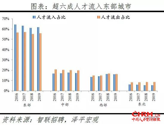 1)分地区看,2019年东部、中部、西部、东北人才净流入占比分别为5.8%、-2.4%、-0.2%、-3.2%,东部人才持续集聚,中西部持续流出但有所收窄,东北持续流出且幅度扩大。全国296个地级及以上建制市(不含三沙市)中,东部、中部、西部、东北城市分别有87、80、95、34个。从人才流入流出占比看,2016-2019年东部地区人才流入占比分别为64.2%、63.2%、60.8%、61.6%,均超六成但稍有下降,意味着全国流动人才超6成向东部集聚;中部地区人才流入占比呈上升趋势,而人才流出占比逐年下降;西部地区人才流入占比和流出占比均呈上升趋势;东北地区人才流入占比分别为6.0%、5.9%、5.3%、5.3%,逐年下降,人才流出占比分别为8.2%、8.2%、8.3%、8.5%,逐年上升。从人才净流入占比看,2016-2019年东部分别为7.8%、6.2%、5.7%、5.8%,虽略有下降但仍维持较高水平;中部分别为-4.0%、-3.2%、-2.4%、-2.4%,虽逐年上升但人才仍然净流出;西部分别为-1.6%、-0.7%、-0.3%、-0.2%,人才净流出但逐年上升至基本平衡状态;东北分别为-2.2%、-2.3%、-3.0%、-3.2%,人才净流出且幅度扩大。