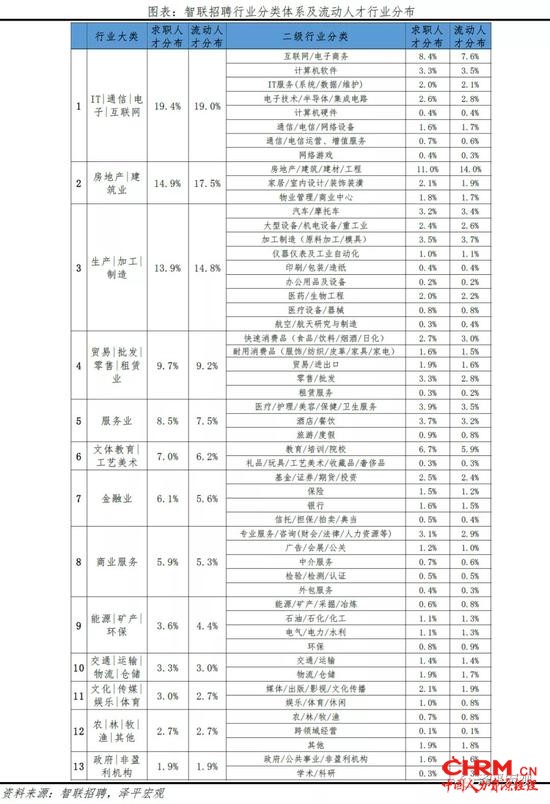 6)从行业看,流动人才中51%分布在IT、房地产、制造业,高于求职人才总体的48%。2019年求职人才最多的前三行业是IT|通信|电子|互联网、房地产|建筑业、生产|加工|制造,分别占比19.4%、14.9%、13.9%,合计占比48.3%;流动人才最多的前三行业也是上述三个行业,分别占比19.0%、17.5%、14.8%,合计占比51.4%,说明流动人才分布更加集中,且流动人才在房地产|建筑业的分布远高于求职人才。从二级行业分布来看,2019年求职人才最多的前五行业分别是房地产/建筑/建材/工程、互联网/电子商务、教育/培训/院校、医疗/护理/美容/保健/卫生服务、酒店/餐饮,合计占比33.7%;流动人才最多的前五行业则略有不同,第四和第五名分别是加工制造(原料加工/模具)、医疗/护理/美容/保健/卫生服务,合计占比34.7%。