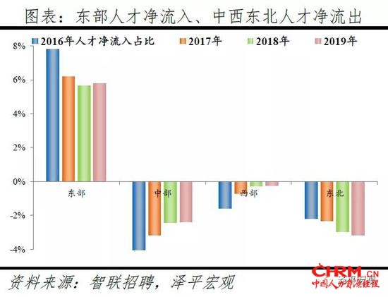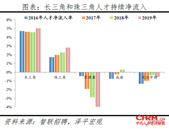 3)分城市群看,超6成人才流向五大城市群,2019年长三角、珠三角、京津冀、成渝、长江中游城市群人才净流入占比分别为5.0%、2.8%、-4.0%、0.0%、-0.5%,长三角、珠三角人才集聚,京津冀受北京控人影响人才净流出,成渝和长江中游基本平衡。从人才流入流出占比看,长三角人才流入占比和人才流出占比均呈下降趋势,2019年分别为22.6%、17.6%;珠三角人才流入占比较为稳定,人才流出占比分别逐年微降,2019年分别为13.9%、11.1%;京津冀2016-2019年人才流出占比分别为14.3%、16.2%、17.0%、17.3%,逐年上升;成渝人才流入占比和人才流出占比均较为稳定;长江中游人才流出占比逐年下降。2016-2019年分别有64.6%、64.7%、64.5%、63.1%的人才流入五大城市群,均超6成。从人才净流入占比看,2016-2019年长三角分别为4.7%、4.6%、4.6%、5.0%,人才净流入且占比高于其他城市群,人才大量向长三角集聚;珠三角分别为1.7%、2.0%、2.2%、2.8%,人才净流入且逐年上升;京津冀分别为-0.4%、-1.9%、-2.9%、-4.0%,人才净流出且流出规模逐渐扩大,主要受北京人才净流入占比逐年大幅下降影响;成渝分别为-0.7%、-0.2%、0.3%、0.0%,流入流出基本平衡;长江中游分别为-1.3%、-1.0%、-0.3%、-0.5%,流入流出基本平衡。