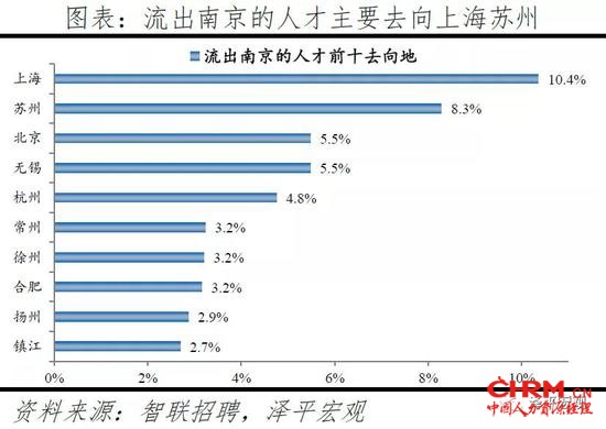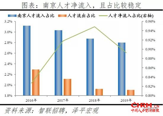 2)南京:2016-2019年人才净流入占比分别为0.8%、0.9%、0.9%、0.9%,始终为正且比较稳定,主因南京发展速度较快且2018年“宁聚计划”实施吸引人才。和上述其他城市相比,南京常住人口增量相对稳定,2011-2019年始终在2-10万区间波动、2019年为6万。2016-2019年南京人才流入占比分别为3.1%、3.0%、2.9%、2.8%,人才流出占比分别为2.3%、2.1%、1.9%、1.9%,均逐年下降,但人才流出明显大于流出,使得南京人才净流入占比分别为0.8%、0.9%、0.9%、0.9%,基本稳定。主要因为落户条件放宽且电子通信、制造业等行业增长速度较快。2018年“宁聚计划”即《人才落户实施办法》实施,不再以就业为落户前提,年龄条件也从35岁放宽到40岁。根据各市统计局数据,2019年南京GDP同比增长7.8%,不仅高于全国的6.1%,也在十大重点城市中排名第一;2018年南京规模以上工业增加值同比增长7.8%,高于全国的6.2%,其中,新能源汽车、工业机器人(11.960, 0.15, 1.27%)、集成电路产量分别增长253.1%、108.9%、29.6%,高于全国的66.2%、6.4%、11.2%。从来源看,人才向南京流入的前十大城市分别是北京、上海、苏州、无锡、合肥、杭州、西安、深圳、徐州、成都,合计占比达45.7%。其中,有5个是长三角地区,合计占比达25.8%。从去向看,南京人才外流的前十大城市分别为上海、苏州、北京、无锡、杭州、常州、徐州、合肥、扬州、镇江,合计占比达49.5%。其中,有8个是长三角地区,合计占比达40.8%。南京和长三角的人才互动非常频繁,部分因为南京高校较多,长三角人才为求学向南京集聚,毕业后从南京回流至长三角其他城市。根据教育部数据,南京普通高校数、211高校数分别为34、10所,分别排名第6、3名。