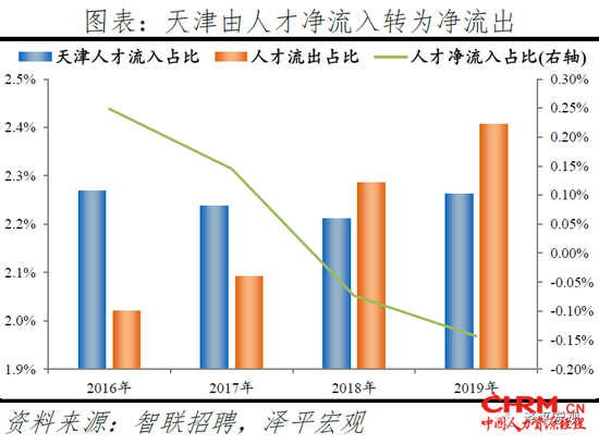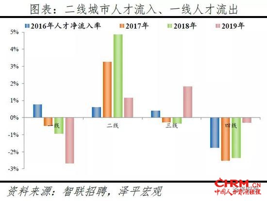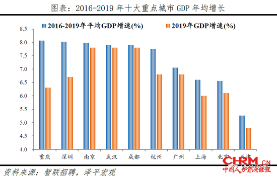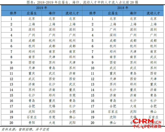 重点城市:深广杭宁渝汉人才净流入占比逐渐上升。1)一线城市:北上人才净流入占比逐年下降、深广呈上升趋势。北京2016-2019年人才净流入占比分别为-0.7%、-2.3%、-2.7%、-3.9%,持续为负且降幅扩大,主因北京严控人口、疏解产业,北京和上海互为人才外流第一目标城市,北京流向上海、上海流向北京的人才流出占比分别为0.8%、0.6%,人才从北京净流向上海;上海2016-2019年人才净流入占比分别为1.3%、1.2%、0.9%、0.5%,持续净流入但逐渐下降,主因上海控制人口及产业转移;深圳2016-2019年人才净流入占比分别为-0.2%、0.1%、0.4%、0.2%,主因深圳活力强、人才政策吸引力大;深圳和广州互为人才外流第一目标城市,深圳流向广州和广州流向深圳的人才流出占比分别为0.7%、0.6%,规模基本平衡;广州2016-2019年人才净流入占比分别为0.3%、0.5%、0.5%、0.6%,持续稳定净流入,主因广州发展(5.740, -0.04, -0.69%)速度较快、生活成本在一线城市中最低。2)二线城市:杭宁渝汉人才净流入占比呈上升趋势,津蓉有所下降。杭州2016-2019年人才净流入占比分别为0.8%、1.0%、1.2%、1.4%,始终为正且逐年攀升,主因杭州以电商为代表的产业发展迅速、薪酬超越广州在十大城市中位列第四;南京2016-2019年人才净流入占比分别为0.8%、0.9%、0.9%、0.9%,始终为正且比较稳定,主因南京发展速度较快且2018年“宁聚计划”实施吸引人才;重庆2016-2019年人才净流入占比分别为-0.1%、-0.1%、0.5%、0.3%,2018年由负转正主因信息技术产业等发展吸引人才;武汉2016-2019年人才净流入占比分别为-0.3%、0.0%、0.8%、0.1%,2017年由负转正,主因2017年“百万大学生留汉”政策实施;天津2016-2019年人才净流入占比分别为0.2%、0.1%、-0.1%、-0.1%,逐年下降且2018年由正转负,主因天津发展速度放缓、2019年GDP增速5.3%在十城中最低、且薪资在十城中最低;成都2016-2019年人才净流入占比分别为-0.8%、-0.3%、-0.3%、-0.6%,始终为负,主因薪资水平较低,重庆与成都互为人才外流第一目标城市,人才从成都净流向重庆。