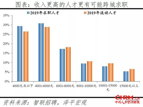 5)从工资水平看,流动人才中45%月收入超6000元,明显高于求职总体的40%,收入较高者更有可能跨城求职。求职人才中月收入4000元及以下、4001-6000元、6001-8000元、8001-10000元、10001-15000元、15000元以上分别占比29.3%、30.8%、17.2%、9.4%、8.0%、5.3%,流动人才中各收入人才分别占比26.4%、28.8%、18.1%、10.6%、9.6%、6.5%,其中6000元以上的分别占比39.9%、44.8%,而在2018年上述比例分别为39.9%、45.8%,说明收入更高的人才更有可能跨城求职。