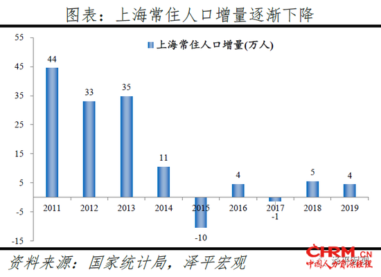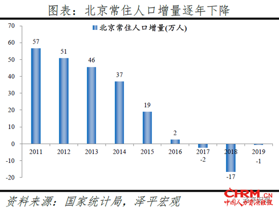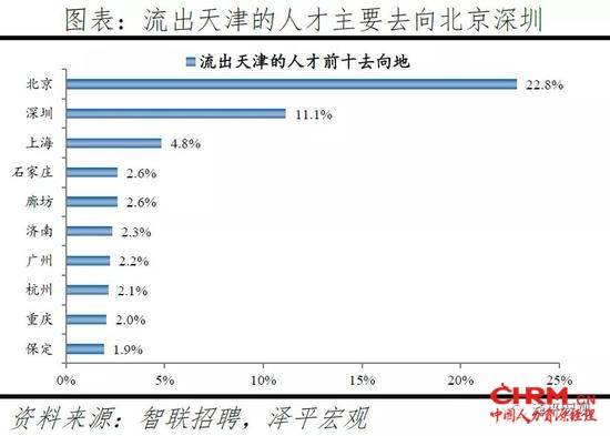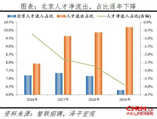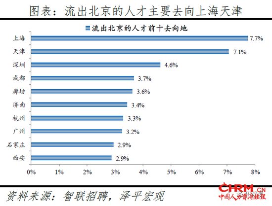 1)北京:2016-2019年人才净流入占比分别为-0.7%、-2.3%、-2.7%、-3.9%,持续为负且降幅扩大,主因北京严控人口、疏解产业;北京和上海互为人才外流第一目标城市,北京流向上海、上海流向北京的人才流出在全国流动人才总量中占比分别为0.8%、0.6%,人才从北京净流向上海。北京常住人口增量逐年下滑,2011-2018年从57万降至-17万,2019年缩窄至-1万,2017-2019年连续3年为负,2016-2019年北京的常住人口增量始终在一线城市中最低。2016-2019年北京人才流入占比分别为7.2%、7.3%、7.1%、6.3%,但人才流出占比持续攀升,分别达7.9%、9.6%、9.9%、10.2%,北京的人才流入和人才流出均居全国城市首位,但流出逐年攀升、流出明显大于流入,使得人才净流入占比分别为-0.7%、-2.3%、-2.7%、-3.9%。从来源看,2019年人才向北京流入的前十大城市分别为上海、天津、郑州、深圳、廊坊、石家庄、西安、成都、沈阳、武汉,合计占比达44.7%。其中,京津冀城市有3个,合计占比达15.6%。人才流入北京主要因为北京经济体量大、薪酬水平高,2019年GDP规模达到3.5万亿,仅次于上海、排名第二,同时13个行业中北京有8个的薪酬位于所有城市之首。从去向看,北京人才外流的前十大城市分别为上海、天津、深圳、成都、廊坊、济南、杭州、广州、石家庄、西安,合计占比达42.5%。其中,流出北京的人才中7.7%流向上海,流出上海的人才中13.1%流向北京,北京和上海互为人才外流目标城市的第1位,北京流向上海和上海流向北京的人才流出在全国流动人才总量中占比分别为0.8%、0.6%,人才从北京净流向上海。流出北京的人才增多主要因为北京控制人口、疏解产业。2013年北京开始严控人口,2015年发布的《京津冀协同发展规划纲要》要求北京外迁非首都核心功能,2020年及之后北京常住人口控制在2300万人以内。根据北京市发改委,截至2019年底,北京市不予办理的工商登记业务累计达2.28万件;2014-2019年北京市退出一般制造业企业2759家,疏解提升市场631个、物流中心122个。根据国家统计局数据,2014-2018年北京规模以上工业企业单位数累计减少489家。2019年北京流出人才的29.7%来源于IT|通信|电子|互联网行业,高于除深圳外的其他8个重点城市,也高于北京流入人才流向该行业的比例23.4%。