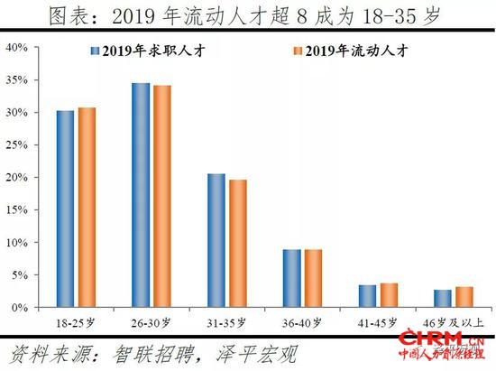 2)从年龄看,流动人才中超8成为18-35岁。2019年求职人才中18-25岁、26-30岁、31-35岁、36-40岁、41-45岁、46岁及以上分别占比30.2%、34.5%、20.5%、8.8%、3.4%、2.6%;流动人才中各年龄段人才分别占比30.7%、34.1%、19.6%、8.8%、3.7%、3.1%,求职人才和流动人才的年龄结构较为吻合,18-35岁分别占比85.1%、84.4%,而在2018年上述比例分别为86.1%、78.6%,2019年流动人才更加集中于18-35岁。