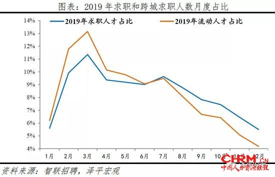 数据说明及特征:智联招聘拥有约2亿个人注册用户,日均活跃用户数(含登录、有求职行为的用户)约630万,其中,求职人才即当年有简历投递行为的用户中约85%为专科及以上学历,远超全国就业人口总体的14.6%(2015年小普查数据);在求职人才中,约四成为跨城求职者,即现居住城市和简历投向城市不同的流动人才。人才求职和跨城求职具有明显的月度波动性,求职高峰一般在春节后的3月,2019年3月求职人数和流动人数占比分别为11.3%、13.1%,2018年分别为12.1%、12.3%。