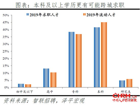 3)从学历看,流动人才中52%为本科及以上学历,明显高于求职总体的47%,表明高学历人才更有可能跨城求职。2019年求职人才中初中及以下、高中、专科、本科、研究生学历占比分别2.5%、13.0%、38.4%、41.5%、4.7%,其中流动人才各学历分别占比为2.1%、10.4%、36.8%、45.0%、5.7%,流动人才中本科、研究生学历比重均高于整体水平,2019年流动人才中本科及以上学历占比50.7%、较求职整体的46.2%高出4.5个百分点,而在2018年上述比例分别为50.5%、47.5%,说明本科及以上的求职者职场竞争力较强、更有可能跨城求职。