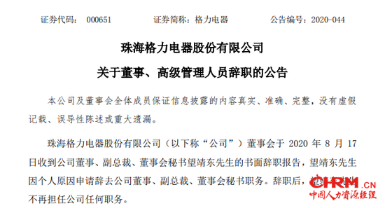 去年8月17日晚间,格力电器发布公告,公司于8月17日收到公司董事、副总裁、董事会秘书望靖东的书面辞职报告,望靖东因个人原因申请辞去公司董事、副总裁、董事会秘书职务。辞职后,望靖东不再担任公司任何职务。