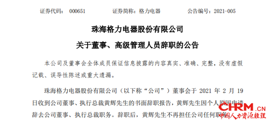 2月21日晚间,格力电器(000651)公告称,公司董事、执行总裁黄辉因个人原因申请辞去公司董事、执行总裁职务。辞职后,黄辉先生不再担任公司任何职务。截至公告日,黄辉持有公司股票738万股,占公司总股本的0.12%。