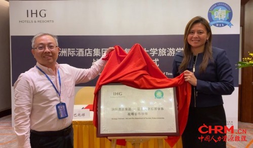 复旦大学旅游学系教授、博士生导师,旅游教研室主任巴兆祥教授(左)与洲际酒店集团大中华区人力资源副总裁许莹莹女士为战略合作伙伴铜牌揭幕