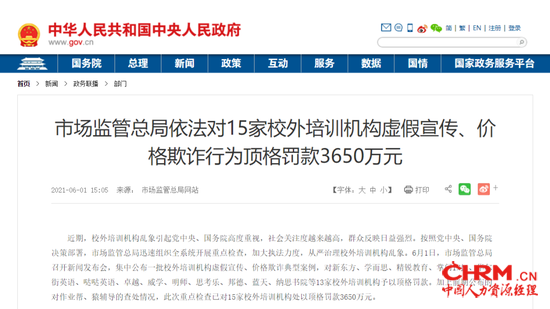 6月1日,15家校外辅导机构,因虚假宣传、价格欺诈等原因,被处以顶格罚款,共计3650万元。