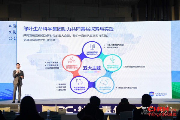 绿叶生命科学集团品牌与公共关系副总裁杨亮出席了颁奖典礼,并发表主题演讲。杨亮系统阐述了绿叶生命科学围绕“1、支持科研创新,深化高校合作;2、帮扶小微企业,促进产业升级;3、振兴乡村经济,带动农民增收;4、关注基层健康,共享医疗资源;5、关爱弱势群体,推动文体事业”五大主题,通过持续开展的十项卓有成效的公益行动,在助力共同富裕方面进行的探索与实践,在会场引起了热烈反响。