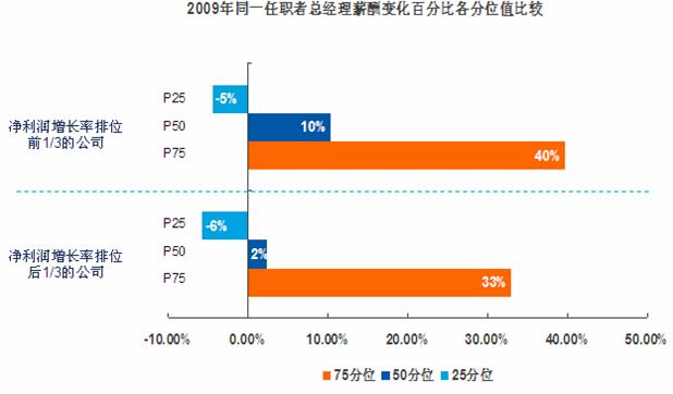 2009年经济形势好转,各行业净利润普遍较2008年有所增长,总经理薪酬水平也随之呈现普遍上涨。在沪深300上市公司中,业绩和高管薪酬存在的相关性是比较明显的,2009年净利润增长率排名前1/3的公司其高管薪酬增长百分比各分位值均高于净利润增长率排名后1/3的公司,说明业绩增长好的企业会带动其高管薪酬较高的增长。