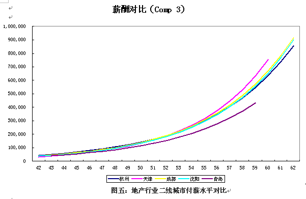 中国地域广阔,一、二、三线城市不仅在地理位置上分散,而且经济发展状况、消费水平、薪酬水平均呈现较大差异。领先的多区域运作的地产企业,已经建立以城市级别为基础,兼顾职位层级与职能差异的垮区域薪酬管理办法。美世调查结果显示,一线城市平均薪酬高于二线城市约24.1%。北京、上海、深圳、广州四个一线城市中,各层级员工,以深圳的年度全薪最高。管理层级员工薪酬,深圳最高,其次是上海,北京率低于上海,广州最低;专业员工及辅助层级员工薪酬,深圳最高,其次是北京,上海,广州最低,见图四。五个二线城市中,管理层级员工薪酬,天津最高,其次是成都,沈阳,杭州,青岛,见图五。