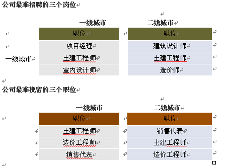 一线城市,最难招聘的三个职位分别是项目经理、土建工程师、室内设计师。土建工程师、造价工程师、销售代表成为最难挽留的三个职位。二线城市中,建筑设计师、销售代表分别是最难招聘及最难挽留的职位。