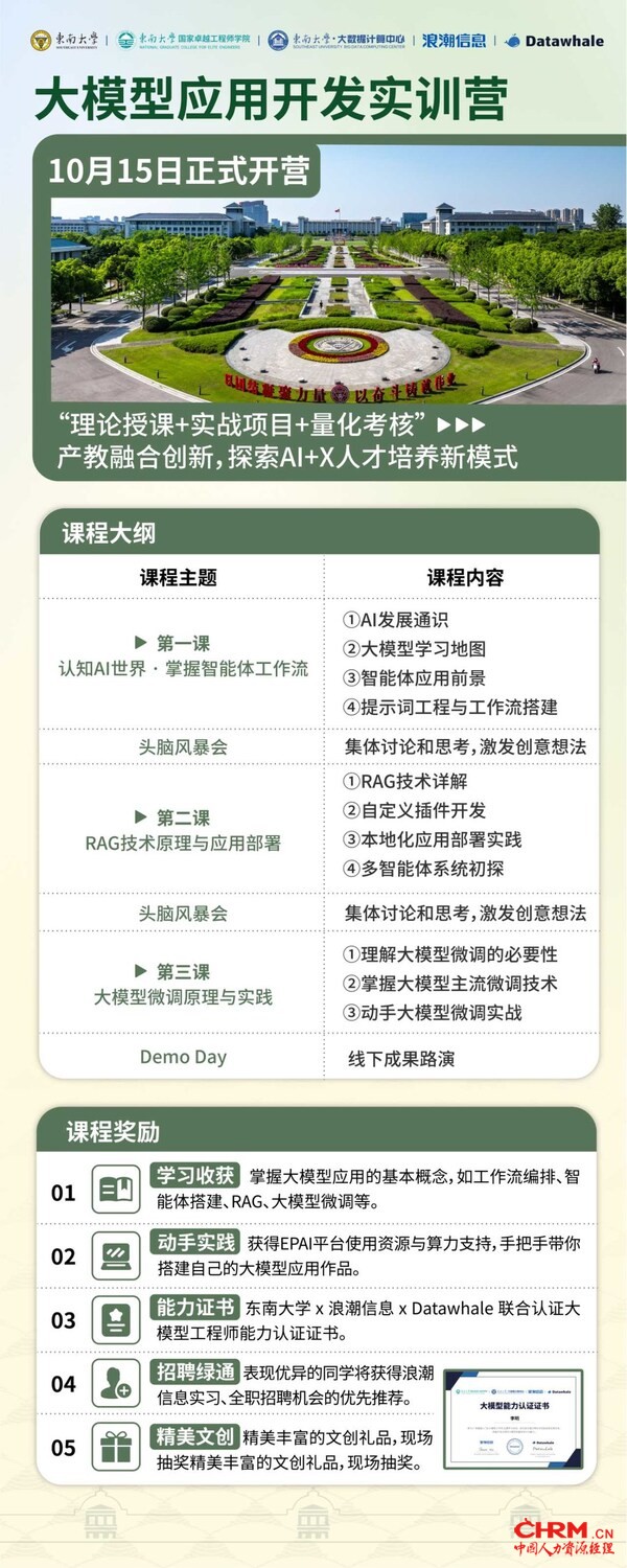 10月15日,由东南大学国家卓越工程师学院、东南大学大数据计算中心、浪潮信息与Datawhale开源学习社区联合主办的"大模型应用开发实训营"系列课程正式启动。本次实训营采用"理论+实操"双轨教学模式,重点引导学生在学习、科研与就业等场景中应用大模型技术,通过为期三周的系统性课程,助力百余名硕博研究生跨越从AI认知到实战应用的鸿沟,全面提升技术能力与创新思维。