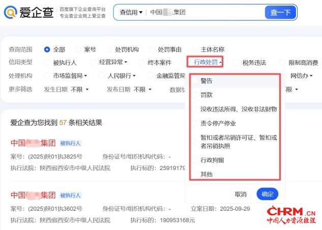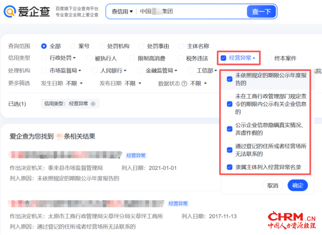 比如,若想有针对性地了解“中国 xx 集团”过往有无异常经营或处罚信息,只需在“信用类型”选项下勾选「经营异常」「行政处罚」两项,即可一键锁定目标信息,直观查看该企业的经营异常具体情形(如住所失联、年报未公示)、行政处罚事由、处理机构及结果等核心内容。