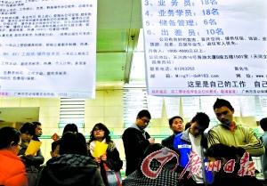 19日,记者在番禺区人才市场农民工招聘专场看到,前来求职的农民工络绎不绝,几乎个个都手握小本和笔,认真地记下招聘单位的联系方式和相关岗位的工资待遇,不少招聘单位的摊位前排起了长龙。