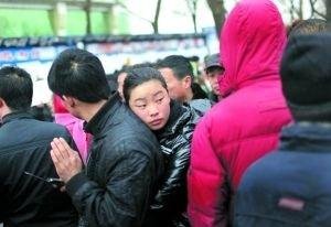 一对王姓情侣一同来到怀柔劳务市场找工作。女孩环抱着男友的后腰靠着休息。