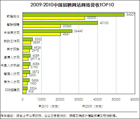 艾瑞的统计数据显示,2010年中国招聘网站的网络招聘营收中,前程无忧最高,达到5.4亿元,占整个网络招聘市场的32.0%;智联招聘营收规模位居第二,达到4.01亿元,市场份额达到24.7%。
