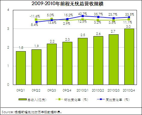 根据前程无忧历年财报数据显示,2010年前程无忧总营收规模达10.8亿元,各个季度营收规模环比均有大幅增长。艾瑞咨询分析认为,2010年前程无忧营收规模保持稳步增长的主要原因有二:一是金融危机过后,雇主和求职者对招聘市场的需求,客观上带动了前程无忧营收的增长;二是前程无忧根据市场需求,对其内部业务结构进行了相应的调整,适应市场需求,促进了前程无忧的进一步发展。